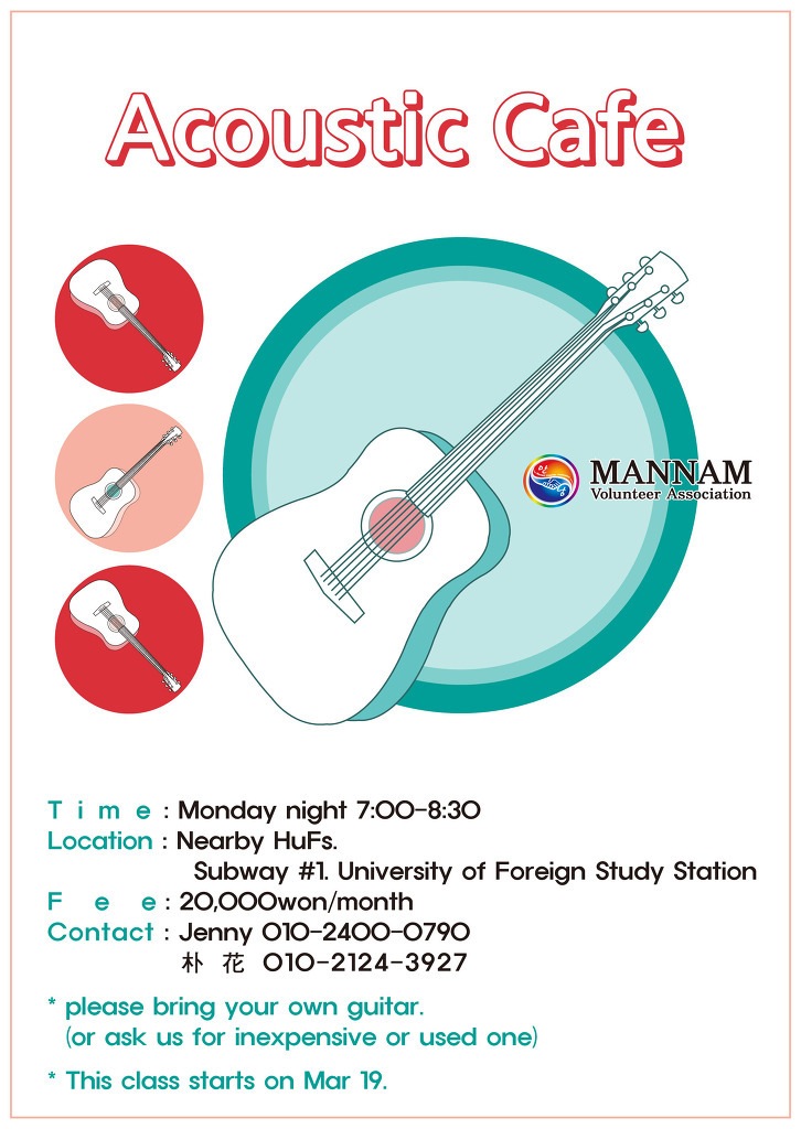 3) Acoustic Cafe, Guitar class at 7:00pm~8:30pm every Monday