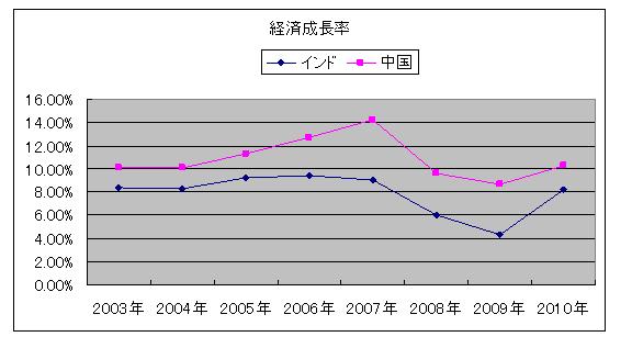 グラフは、2003年~2010年の経済成長率です。中国は毎年8%以上の成長が続いており、インドも中国に次ぐ高い経済成長を達成させています。