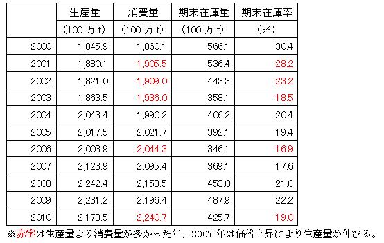 세계의 식량 생산은, 2000년에는 경작 면적이 거의 포화 상태가 되어 있어, 단위면적 당의 수확량을 늘리는 것으로 식료를 증산하고 있는 것 같습니다.곡물의 생산량, 소비량, 재고량, 재고율,적자는 소비량이 생산량을 웃돈 해.