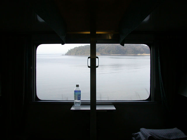 朝、車窓に見える瀬戸内海、朝日が昇る光景がのんびり見られます。