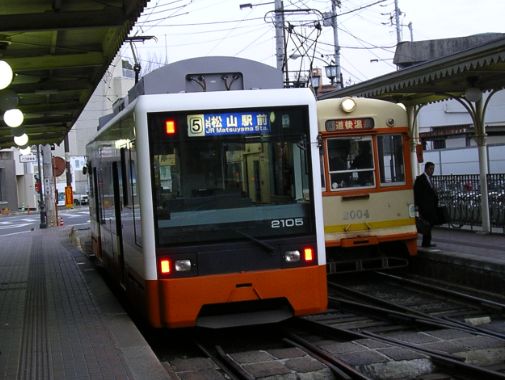 아래의 사진은 이요철도의 시내 전철입니다.앞에 있는 것은 최근 도입된 신차량에서, 안쪽에 있는 것은 옛부터 있는 구차량입니다.