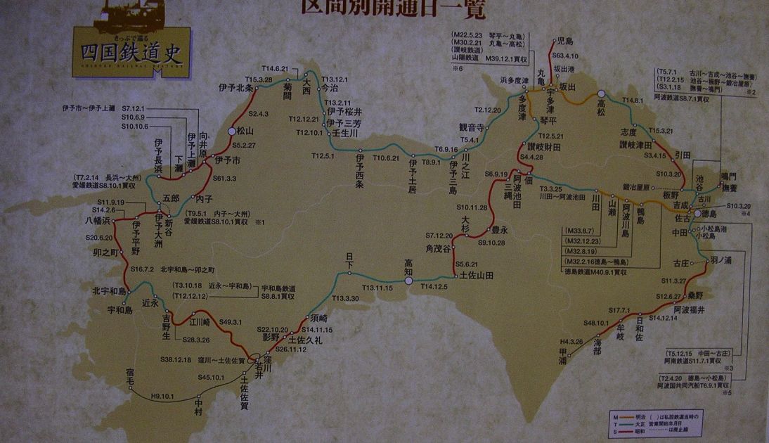 카가와현이나 토쿠시마현에서는 비교적 철도의 정비가 빨리, 코치현이나 에히메현에서는 정비가 늦은 것을 압니다.(사철은 더 빠른 단계로부터 있었습니다만…)