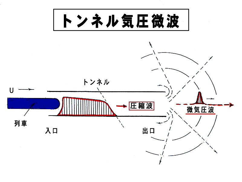 산요신칸센은 터널이 많은 일로는 세계 제일입니다.전선의 반은 터널입니다.열차가 고속으로 좁은 터널에 돌입하면, 공기의 압력 물결이 일어 , 이것이 점점 성장해 해일과 같이 음속으로 전해져, 터널 출구측에서 반사해 돌아옵니다.이 터널 출구에서 일부의 압력파가 방출되어 그 때, 파칸과 파열음을 내는 일이 있습니다.압력은 대기압의 겨우, 0.11%이하의 것이므로, 터널미기압파라고 부르고 있습니다.원리도는 그림 3에 나타내는 대로입니다.열차의 단면적이 큰 만큼, 터널의 단면적이 작은 만큼, 또 열차 속도가 고속으로 되면 과연(속도의 세제곱에 비례), 이 압력파는 터널 출구 부근의 분들에게, 소리와 진동으로 폐를 끼치는 일이 됩니다.그러나, 이제 와서 터널 단면적은 바꿀 수 없습니다.우선 지상의 터널 입구 측에 완충갱(관상 이렇게)으로 불리는 압력파 완화 장치를 마련해 대책을 강구해, 성과를 올려 왔습니다.단지 이 완충갱은 야간 공사등을 위해서 대단한 공사비가 듭니다.기세 차량 측에 대책이 요구되었습니다.