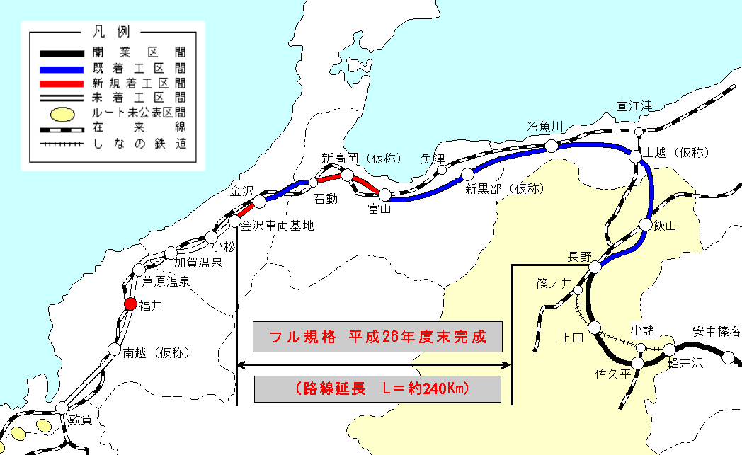 호쿠리쿠 신간선은 도쿄에서 나가노, 토야마, 카나자와, 후쿠이등을 거치고 오사카를 연결하는 약 700킬로의 노선.나가노까지는 나가노 신간선으로 불리고 있어2014년도중에 나가노-카나자와간이 개업예정.후쿠이역은 착공하고 있지만, 카나자와역의 앞의 하쿠산 종합 차량 기지로부터 츠루가까지는 미착공.츠루가 이서의 루트는 정해져 있지 않다.