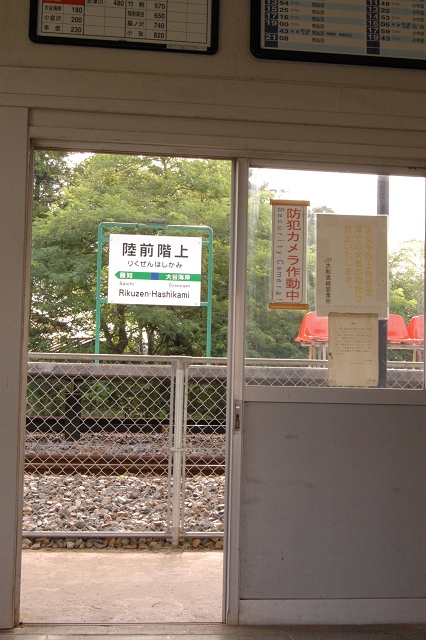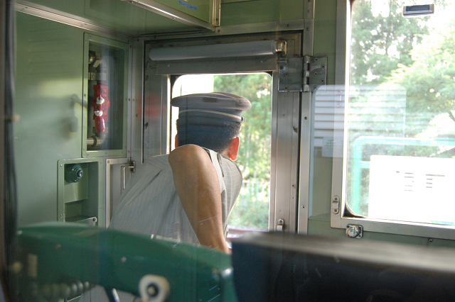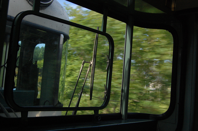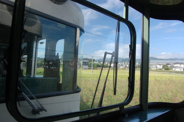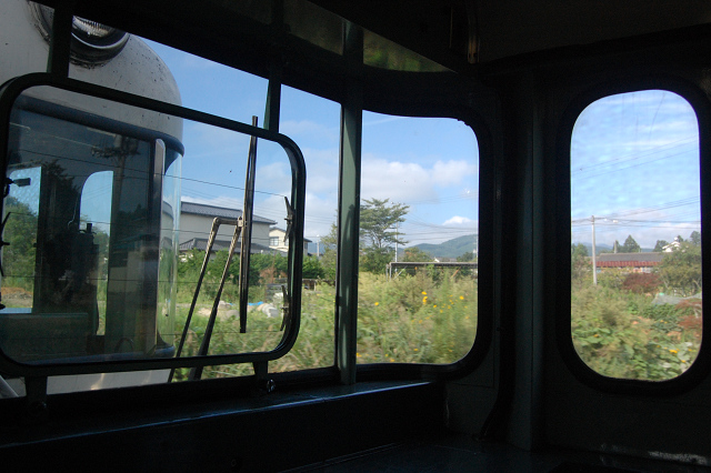 学生達の群れを避け、車両の連結部分から車窓の風景を眺めていました。