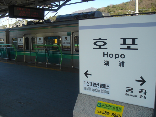 나는 동일한 홈에서 [양산 Yang-san]행 전차를 기다려요
