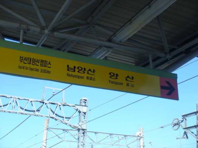 私は等しいホームで [梁山 Yang-san]行電車を待ちます