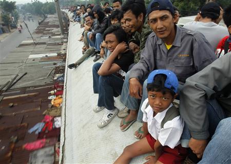 インドネシア・西ジャワ州のデポックで、ジャカルタへ向かう超満員の通勤電車
