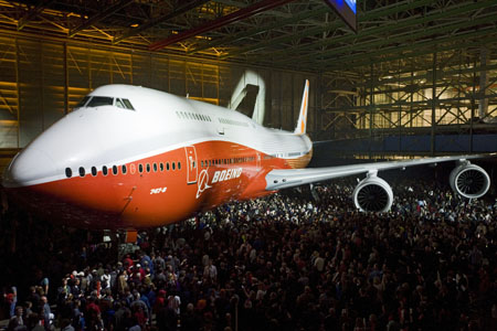 미 항공기 대기업 보잉(Boeing)은 13일, 최신형 점보 제트 여객기「747-8 인터콘티넨탈(747-8 Intercontinental)」를 미국 워싱턴(Washington) 주 이브 렛(Everett)의 동사 공장에서 첫피로했다.