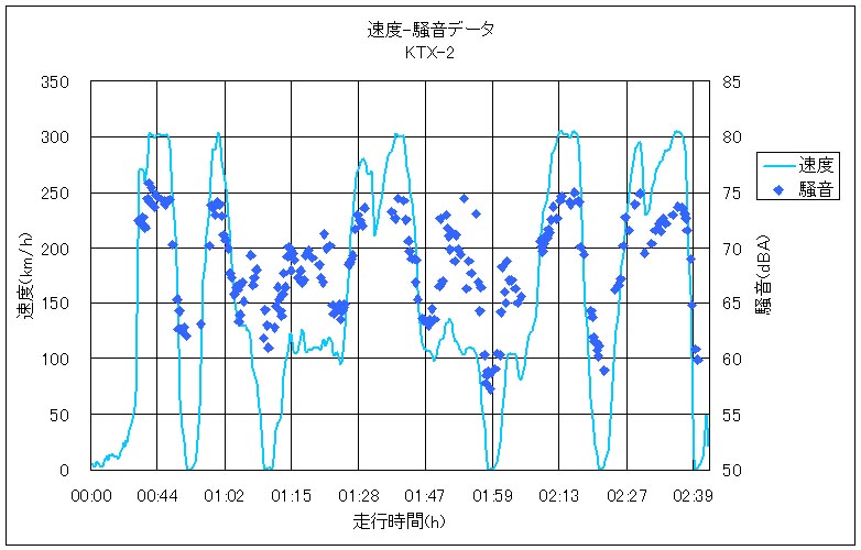 KTX-2のグラフには、100140km/h付近の騒音が大きい部分がありますが、これは、上でお知らせした在来線を走っているときの騒音ですね。