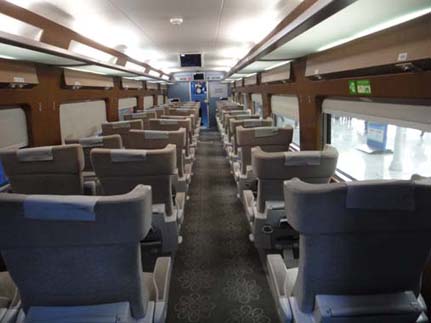 写真でも、その違いの一端は良くわかります。KTXにはあった窓際の照明が無くなり、天井だけになってしまいましたね。全体的に明るくなって、新幹線に似たような方式になりましたが、個人的には、ちょっと暗めのKTXのほうが好きですね。KTX-2は、全室の派手な色使いを含めて、どことなく、安っぽい感じがします。