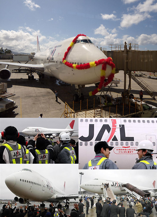 나리타에 도착한 것은, 국내선의 나하발의 3098편, 국제선의 호놀루루발 75편.일본 항공의 점보기는, 피크시의 94년부터 2001년에는 약 80기가 운항하고 있었다.그러나, 원유가 상승등으로 연비의 나쁨등이 일본 항공의 실적을 압박하는 요인으로도 되었다.작년 2월에 회사 갱생법의 적용을 신청해, 재건을 향한 정리해고의 일환으로서 전기의 퇴역을 결정했다.