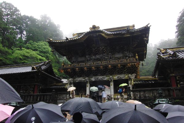東京を出たときは若干曇っていた程度でしたが、日光に到着する頃には天気予報通りの雨降りになっていましたよ。そして駅舎から外に出ようとすると・・・、