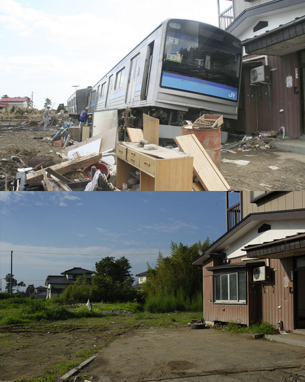 仙石線野蒜駅(宮城県東松島市)付近で、津波に流された上りあおば通行き列車(上=4月12日、福井洋平撮影)。