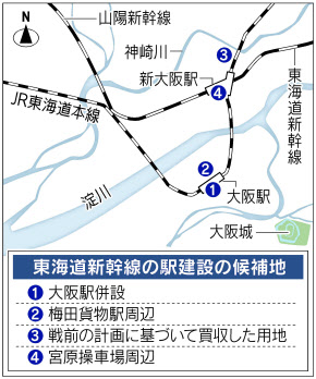 旧国鉄が65年に発行した「東海道新幹線工事誌」などによると、大阪は折り返し駅となるため、広い用地が必要だった。候補地は(1)大阪駅に併設(2)梅田貨物駅(大阪市北区)付近(3)戦前の「弾丸列車」計画で国鉄が買収した、東淀川駅(大阪市淀川区)近くの用地(4)宮原操車場(同区など)付近――の4カ所あったという。