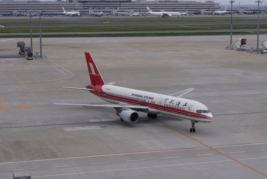 羽田に到着。国際線ターミナルで一休みします。上海から到着したFM815便、上海航空(Shanghai Airlines)のBoeing 757-36D [B-2834]です。上海航空は中国東方航空傘下の航空会社で、SHA-HND線には現在、B757を使用しています。