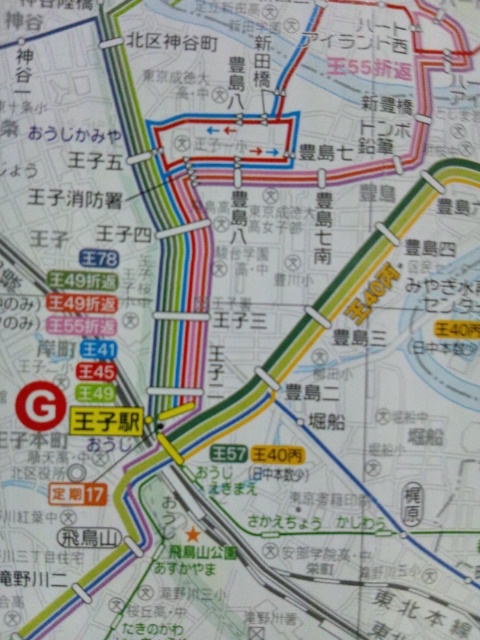 (例:2枚目の王57系統(濃い緑)が王子駅を境に太さが変わっている)