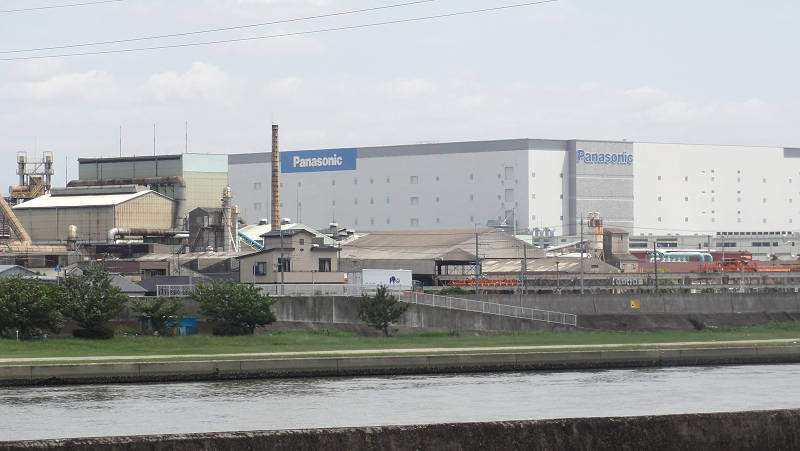 そのまま、駅の下を通り抜けてサイクリングロードを南下すると、川の対岸の向こう側に、Panasonicのかっての世界最大のPDP工場の建物が見えます。3つあるであろう工場の1つでは、現在もPDPの生産は続けられていますが、見える建物は、遊んでいるだけのはずです(なんとも勿体無い)。