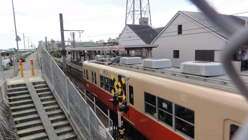 1.7キロしかない短い武庫川線で、終着駅1つ手前の洲先(Suzaki)駅まで来たところで、踏切の警報機が鳴ったので、待ち構えていると、電車がホームに入ってきました。30年前までは、ここが終着駅だったというのを、後で知りました^^.