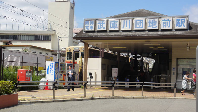 さて、現在の終着駅の武庫川団地駅前に来ました。先ほどの電車が止まっています。短い路線なので、この2両1編成が行ったり来たりしているようですね。30年前までは、ここに阪神の鉄道車両を作っていた「武庫川車両工業」があったようです。武庫川線は、新造や定期検査のために出入りする車両の引込み線でもあったわけです。