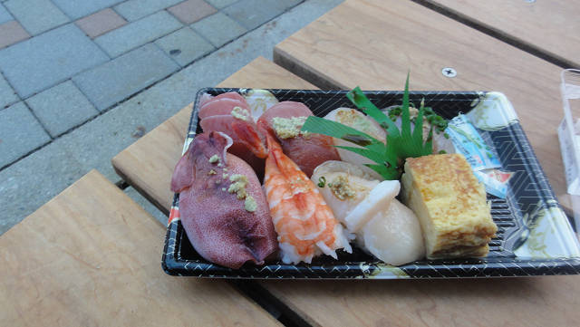 魚市場の営業時間の終了時刻が迫ってきていて、売られている寿司を買いました。今回の旅で一番のご馳走だったかも・・・(新鮮だったし・・・)
