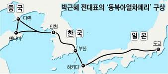 2007년의 대통령 후보 예비 선거에 대하고, 박근혜는 이명박의「한반도 대운하 계획」에 대항해「북동 아시아 열차 페리 구상」를 주창했다.이것은 철도나 선박을 이용해 대한민국과 일본・중화 인민 공화국을 묶어, 국가간의 협력이나 교류를 강화하는 것을 목적으로 한다.