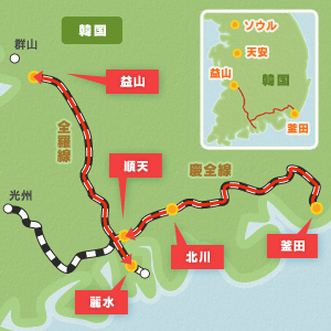 경전선, 전라선, 장항선이라고 진행되어, 군산까지 나오면, 서울이 가깝게 된다.새마을호라고 하는 특급도 서울까지 운행하고 있다. 서울로부터 나리타까지는 에어 아시아가 취항했다.LCC는 편도 단위로 살 수 있으므로, 적당하다.