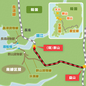 かつて、益山駅から群山まで、群山線という路線が走っていた。この線路は錦江という川でその先を遮られていた。乗客は船で川を渡り、その先の長項線の列車に乗り込んでいった。しかし錦江に列車が走る鉄橋が完成。2008年、群山線は貨物専用路線になった。周辺の工場との間を貨物列車が走っていたが、やがてそれもトラック輸送に代わり、群山線は廃線になってしまった。
