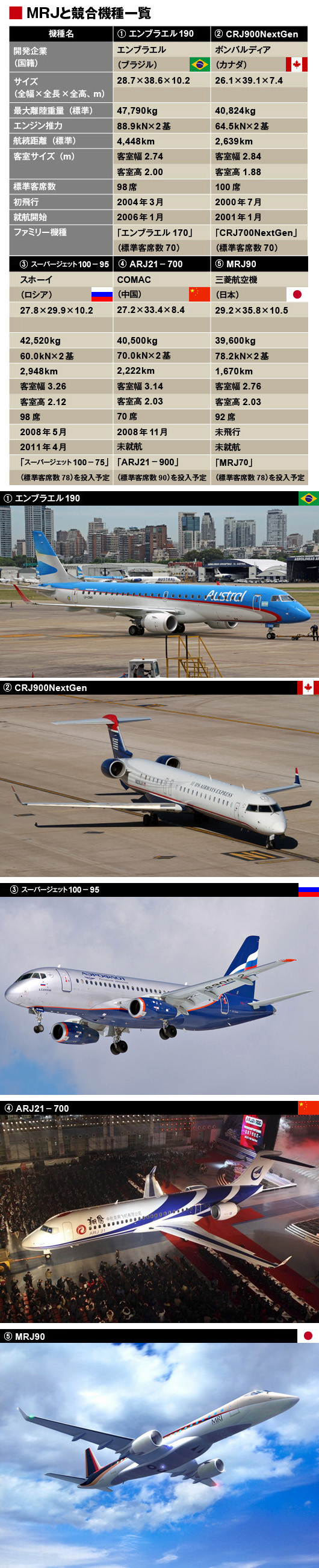 下に掲載した各社の90席級の機種を見ていくと、老舗組のほうがわずかに開発開始時期が早く、最も遅いCRJ900でも開発開始は2000年。新規参入組はARJ21が01年、SSJ―100が03年、MRJが08年であるから、「20世紀組」と「21世紀組」という分け方もできる。ただ開発着手が後になれば、新技術を導入できるなどのメリットがあることは確かだが、その間にライバルに受注を先行されてしまうなど、一長一短があるのも事実である。