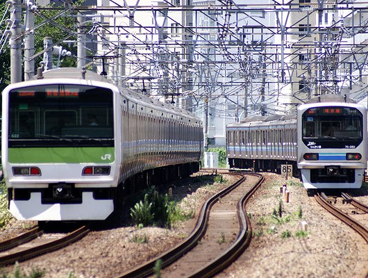 JR恵比寿駅にて。左はJR山手線用のE231系500番台、右はJR川越線・JR埼京線・東京臨海高速鉄道(TWR)りんかい線用のTWR70-000形です。