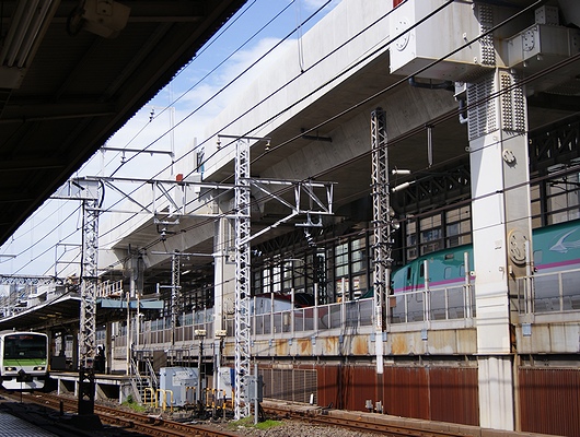 도쿄역의 린역, 칸다역 부근에서는 기존의 고가다리를 무너뜨리지 않고 바로 윗쪽에 고가다리를 증축하는 세계 최초의 공법이 채용되고 있습니다.JR토호쿠 종관선의 고가하를 달리고 있는 것은, 신간선입니다.
