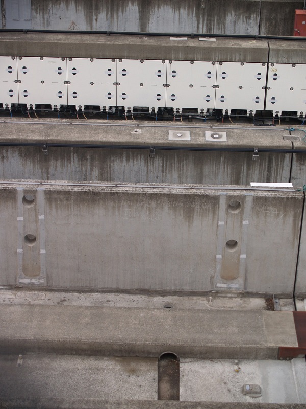 手前は新型浮上案内コイルが設置されていないむき出しの壁面です。タイヤが接地する路盤も見えます。