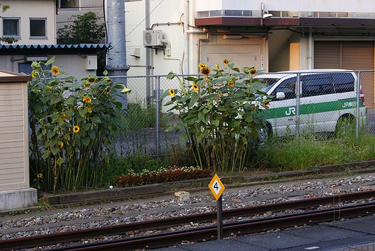 오메역의 선로단에 만들어진 화단.