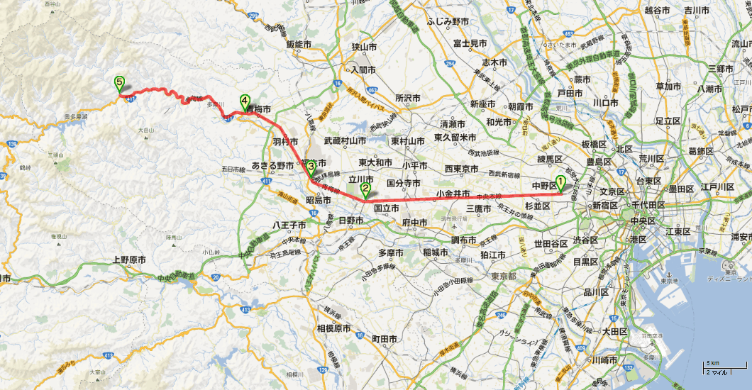 1.中野(Nakano)、2.立川(Tachikawa)、3.拝島(Haijima)、4.青梅(Ome)、5.奥多摩(Okutama)。