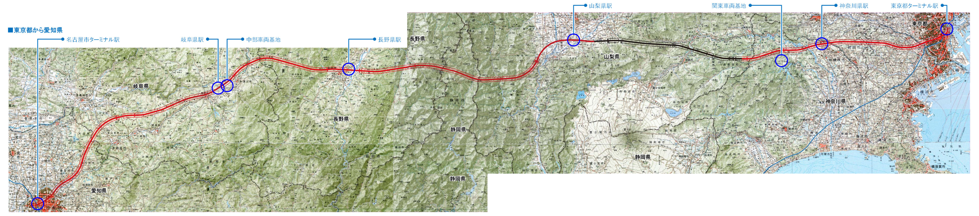 中央新幹線は東海環状自動車道との交差部(岐阜県可児市)から名古屋市ターミナル駅まで1本の地下トンネルとなる。