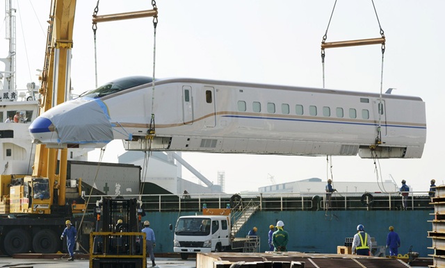 新型車両は、クレーン車2台を使って慎重に陸揚げされた。側面に空色と銅色の2本の線が走る真新しい車体で、流線形をした先頭車両の一部はシートに覆われていた。JR東日本、西日本は近く、報道各社に内装などを公開する方針だ。
