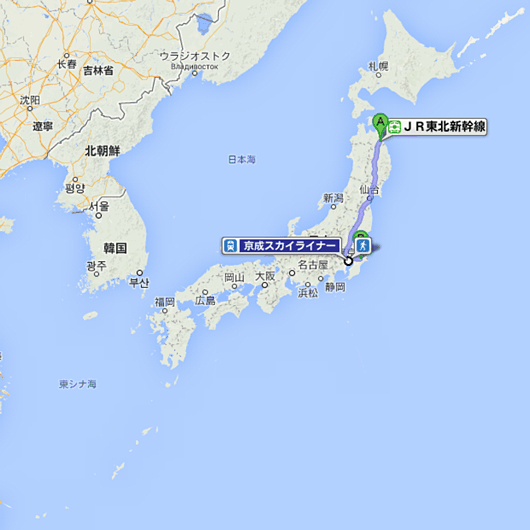 1.토호쿠 신간선의 하치노헤역(아오모리현)으로부터 케이세이선의 공항 제 2 빌딩역(치바현)까지