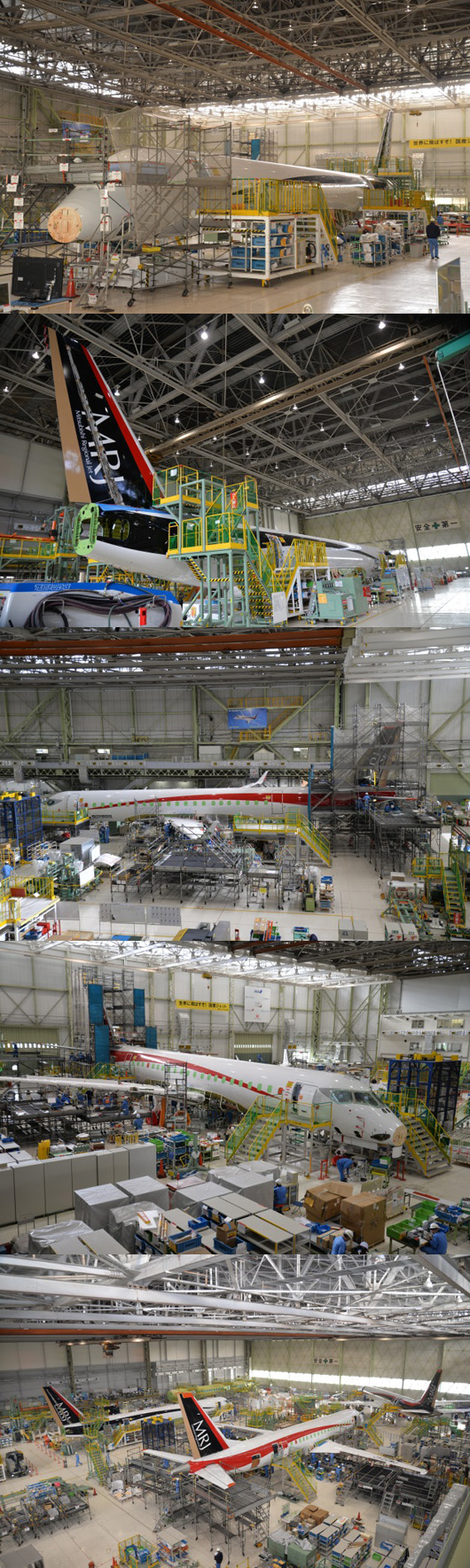 창간호기는, 첫비행을 향해서 각종 기능 시험, 기술 시험을 실시하고 있습니다.2호기는, 익동결합, 다리의 설치가 완료한 단계, 3호기는 익동결합의 작업중, 4호기는 동체 결합이 완료해, 도장 작업을 실시하고 있는 곳(중)입니다.공개한 화상에서는, 2호기의 주 날개에「JA22MJ」라고 기록되고 있는 것을 압니다.