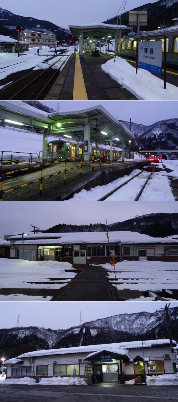 하늘이 어렴풋이 밝아지는 무렵에 도착한 종점 이노타니역은, JR 서쪽과 JR토카이의 경계역.근처의 홈에는 키하 120형 3 양편성이 재선 하고 있습니다만, 진한 개는 토야마행.내가 갈아 타는 열차는 아직 입선 하고 있지 않습니다.