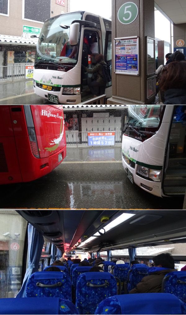 ヒィヒィ言いながら走ってやって来たバスターミナル。しかし、発車時刻になってもそれらしいバスは乗り場に現れず。少し離れた駐車場にそれっぽいバスがいたので乗員に聞いてみると、確かに目当てのバスなんだけど、ゲロ・・・もとい、下呂からやって来たお客さんが休憩で降りていて、その人方が帰ってきてから乗り場に移動して高山からのお客さんを乗せる・・・というような説明。どうもバスは鉄道と勝手が違って、妙に緩い感じで苦手だな。