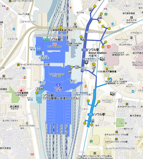 ソウル駅の東の濃い青が地下鉄1号線、薄い青が地下鉄4号線、ソウル駅の西の南に延びる緑かかった薄い青が仁川空港鉄道の地下路線。北からソウル駅に入ってくる緑がかった薄い青の線は