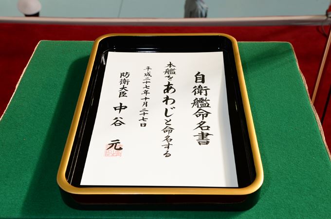 平成29年3月の就役を予定している海上自衛隊の新型掃海艦の命名・進水式が27日、横浜市鶴見区で行われ、瀬戸内海で最大の有人島である淡路島にちなみ「あわじ」と命名された。