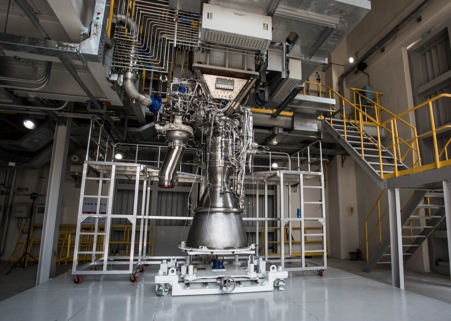 75秒燃焼試験直前の 75トンエンジン. 下の鐘のようにできた模様が燃焼機で左に飛び出した部分がガス発生器, 燃焼機上側がターボポンプだ. エンジンに付いているケーブルたちはエンジン作動の時圧力や震動, 温度データを得るために附着した装備と繋がれる. 上側ではエンジンの推進力を測定することができる鉄製フレームが繋がれている./金敏洙記者