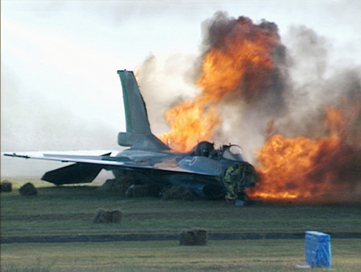 랜딩 장치에 문제를 일으켜  착륙에 실패해 사고를 일으킨 F-2전투기