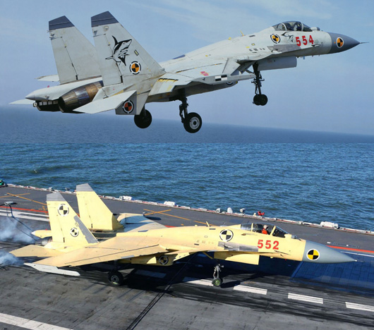 중국 전투기 J-15, 항공 모함 착륙 훈련중에 추락!