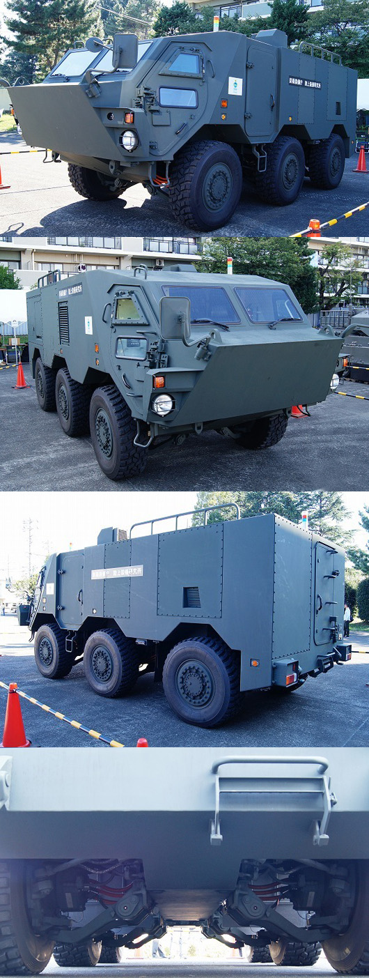 방위 장비청・육상 장비 연구소는 15일에 간 시설의 일반 공개에 대하고, 개발을 진행시키고 있는「경량 전투 차량 시스템」의 시험 차량을 처음으로 피로했다.인원 수송을 상정한 차량으로, 6륜 모두에게 인 휠 모터를 장착한 풀 EV가 되고 있다.