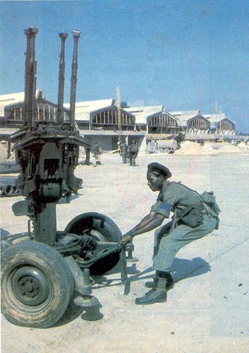 그레나다군 주요 군사시설에 DSHK 4연장 대공포를 설치하고 있는 그레나다 인민군