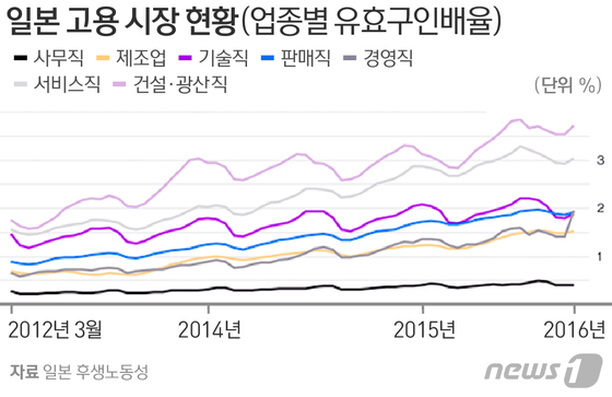 有效求人倍率が 1より大きければ求職者数より空の働き口がもっと多いという意味だ. ブルンバグ分析によれば, 事務職, 製造業, 技術職, サービス職, 建設及び光産業など各業種別求人倍率格差は去る 5年間全然狭められなかった. こんな業種別労動柔軟性欠乏が結局賃金に下落圧力をかけている一原因で解釈されるというのだ.