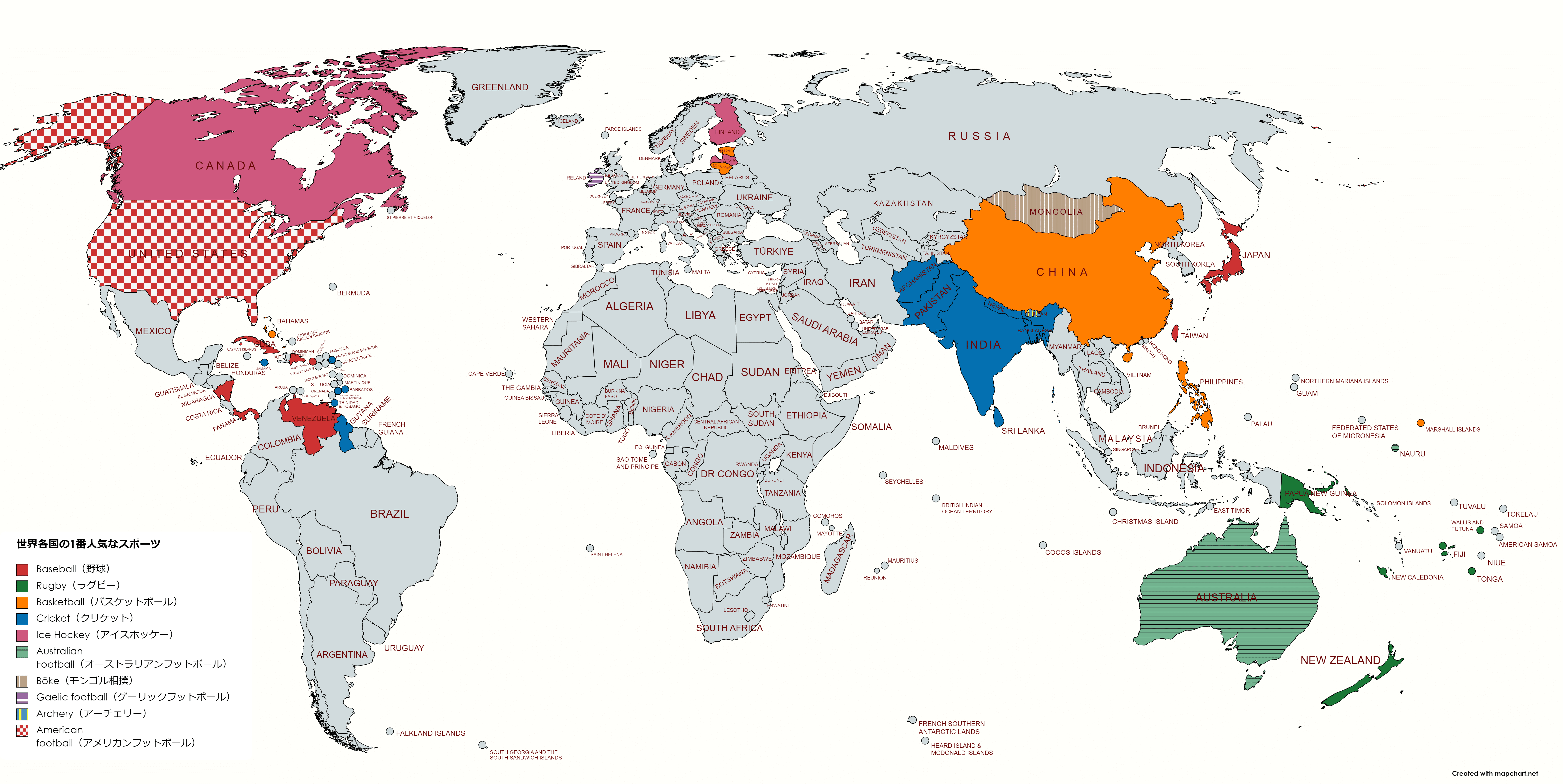 その国で最も人気のあるスポーツで色分けした世界地図