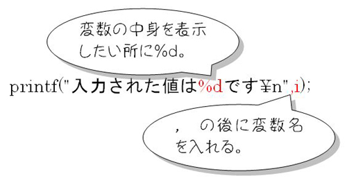 ちなみに、上のscanf関数でも使われていましたが、%dはprintf関数の書式指定文字と呼ばれます。これはprintf関数などにおいて変数をどう表現するか(入力するか)を設定する文字で、他にも%cや%fといった書式指定文字があります。
